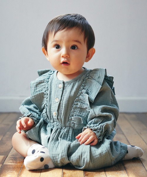 肌当たりの良い綿ガーゼ素材 胸のラッフルフリルがかわいい トレンドのスモーキーカラー 【対象月齢】 80cm:12から18カ月 90cm:18から24カ月 【お手入れ方法】 ・液温は40℃を限度とし、洗濯機で非常に弱い洗濯ができる ・塩素系及び酸素系漂白剤の使用禁止 ・タンブル乾燥禁止 ・日陰のつり干しがよい ・アイロン仕上げ禁止 ・石油系溶剤による弱いドライクリーニングができる 【注意事項】 ・タンブル乾燥機は使用しないで下さい ・漂白剤や蛍光増白剤を配合した洗剤は使用しないでください ・洗濯ネットをご使用ください。