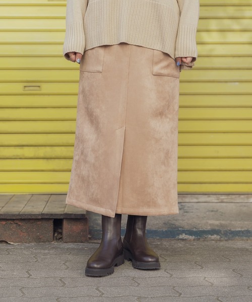 滑らかな質感と柔らかなトーンが上品なフェイクスエードスカート。オープンポケットデザインが腰回りをカバー。フロントスリットで足さばきもよく、ストレートのタイトなシルエットは身体のラインをすっきりと見せてくれます。ゆるっとしたビッグシルエットのニットやフ―ディパーカーなどでカジュアルに。ブラウスやジャケットと合わせてオフィススタイルにもおすすめですよ♪ ----------------------------- 《スタッフ着用コメント》 [スタッフA] 年齢 : 20代後半, 身長 : 161cm, 体型 : 普通/骨格ウェーブ 普段の着用サイズ : M 【着用カラー/サイズ】GREIGE/FREE 【サイズ感】スカートはタイトなシルエットで足首が出る丈感です◎ 【素材感・着心地】スカートはスウェード素材で、透け感もありません! ----------------------------- ※この商品は、摩擦や汗、雨などの使用条件等により、色落ちや他の物への色移りの可能性がございますのでご注意ください。 ※直射日光や蛍光灯に長時間あたると変色したり、色あせすることがありますのでご注意ください。 ※その他お取り扱いに関しましては、商品に付属のアテンションタグをご覧ください。 ※商品画像は、光の当たり具合やパソコンなどの閲覧環境により、実際の色味と異なって見える場合がございます。予めご了承ください。 ※商品の色味の目安は、商品単体の画像をご参照ください。 ▼お気に入り登録のおすすめ▼ お気に入り登録商品は、マイページにて現在の価格情報や在庫状況の確認が可能です。 お買い物リストの管理に是非ご利用下さい。 ----------------------------- 透け感:なし 伸縮性:ややあり 裏地:あり 光沢:なし ポケット:あり -----------------------------