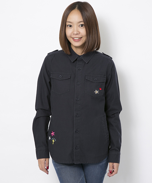 ウォッシュの入った、スラブ素材の無地2色と迷彩のカラー展開のミリタリーシリーズ★クロスや花モチーフのハンド風ステッチが所々にあしらわれていて、カジュアルな中にもかわいさのあるアイテム。バックにはロゴプリントも。ポケット付きで、軽アウターとしてロングシーズン重宝すること間違い無し! model:身長155cm 着用サイズ:1