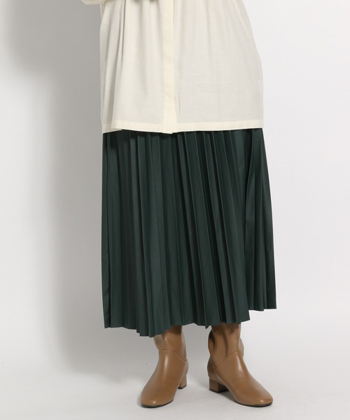 旬素材で定番コーデをアップデート 着るだけで流行りを取り入れられる、レザーライクなプリーツスカート。 素材感が映えるシンプルなデザインは、着回し力も抜群。 ウエストは後ろゴムでスッキリ見え&楽ちん仕様がうれしい。 今年は厚底など、ボリューム感のあるブーツとのスタイリングがオススメです。