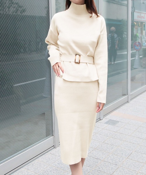 ハイネックのトップス&タイトスカートのセットアイテム。 トップスは付属のベルトでウエストマークをすることで、メリハリのあるスタイルをアシストします。 スカートはウエストゴムなので、ストレスフリーな履き心地。 もっちり感がやみつきになるマシュマロニット素材を使用しました。 上下のニットの編み方を変えているのもオシャレなポイント◎ 【カラー】ブラック・ブルー・ボルドー・グレイッシュベージュ(グレージュ)・アイボリー 【サイズ】ONE 【素材】ポリエステル100% 【透け】やや有り 【裏地】無し 【ストレッチ】有り 【ポケット】無し 【ファスナー】無し ※ご使用のモニターや周囲の環境により実際の商品と多少色味が異なる場合がございます。 ※モデル画像はイメージです。実際の商品に近い色味は商品単品の画像をご確認下さい。 ※生産時期によりカラーやサイズに多少の誤差が発生する事がございます。 ※密閉した状態で商品を入荷しておりますので、店頭にある商品とは違い匂いが多少強く感じられるものもございます。 数日のご使用や陰干しなどで気になる匂いはほとんど感じられなくなりますので、お試しいただきますようお願いいたします。 ■商品のお気に入り登録■ 完売カラーの再入荷や、セール、ラスト1点など通知を受け取ることができます。 ■ブランドのお気に入り登録■ 新商品や再入荷などの情報をお知らせいたします。 是非、お気に入り登録をご活用下さい。
