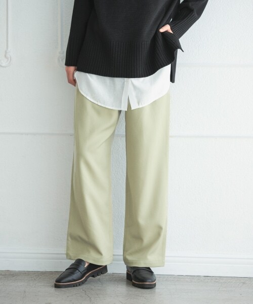 ーーー楽なのにきれいめな印象で穿ける、イージーパンツウエストがゴム仕様で楽な着心地なのに、上品に穿けちゃう嬉しいパンツが登場!優しい発色なのでお仕事などキレイめなシーンにもおすすめのパンツです。ウールのような膨らみのあるポリエステルを使用し、柔らかさと程よい落ち感ですっきりとした印象に。ーーー程よい太さのストレートシルエットで、どんなトップスとも合わせやすく着回し力抜群!