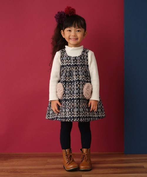 高級感のあるロービングチェック生地を使用したジャンパースカートです。大人っぽいデザインの中に、ボア素材のポケットが可愛らしいアクセントをプラス♪ おしゃれも季節感もゲットできるアイテムはお出かけシーンに欠かせなくなります。肩には着脱をスムーズにするボタンつきです。【おすすめの着用時期は秋シーズン】【透け感】透けない【生地の厚さ】厚い【伸縮性】なし【裏地】あり【ポケット】あり【アジャスター】なし