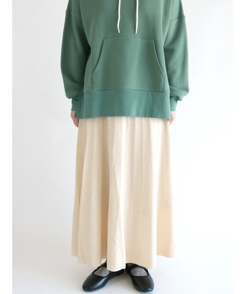 ふんわりあたたかなニット素材が、優し気な印象をメイクするスカート。 幾何ストライプの編地がニュアンスのある表情をみせ、さりげない個性をプラスします。 エレガントなロングレングスなのもポイント。 フェミニンなムードたっぷりのコーデが完成する、おすすめのアイテムです。