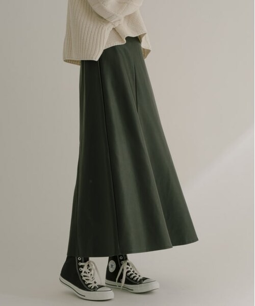 【デザイン・シルエット】腰回りから裾に向かって広がるゆるやかなマーメイドラインが大人っぽいニュアンスでスタイリングできるマキシ丈スカート。フェイクレザーを使用して、奥行きのある秋冬スタイリングへと導いてくれます。裏地無しウエスト背面ゴム【素材感】クラス感が加わるソフトな風合いのフェイクレザー【カラー】渋みのあるマットなブラック、グレー、カーキの3色展開【スタイリングポイント】ハードな質感なので、ふんわりと柔らかなニットやカジュアルなスウェットと合わせ