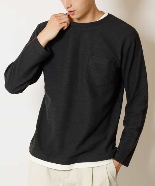 ◆これさえあれば安心。1枚でおしゃれに見える。レイヤードデザインがサマになるカットソー。◆身頃に凹凸感のある程良い厚さのスラブダブルフェイス素材を使用。エリ元と裾に配色の天竺素材を使用している為、一見するとカットソーを重ね着しているかのように見えるデザインがポイント。簡単にレイヤード風スタイルが楽しめます。シンプルなデザインのため、ジャケットやシャツ、カーディガンのインナーとしてもおすすめの1枚で持っていると重宝するオススメカットソーです。