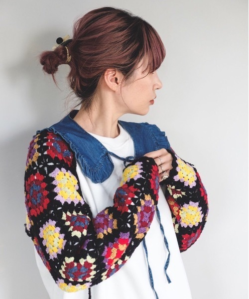 今の気分にぴったりスタイルが完成するショートボレロ。今季トレンドのクロシェ編み。 大きめの網目が甘すぎない印象に仕上げてくれます。 彩り豊かで立体感のあるモチーフを繋いだフラワーデザインが、どこか懐かしいレトロな印象に。 フロントのリボンは縛っても、縛らなくてもOK。着こなしに合わせてアレンジできます。 ノースリーブや半袖のトップスの上にも羽織れるのがポイント◎ ショート丈でスタイルアップ! ワンピースに合わせたり、ロゴTシャツに合わせたり様々なレイヤードを楽しめるアイテムです。 スウェットの合わせが、SANSëLFらしい。 ※ひとつひとつ手作業で裁縫しているため、写真のデザインと多少の誤差があることがございます。ご了承お願いいたします。 伸縮性: あり 透け感: なし 光沢: なし 裏地: なし 厚さ: 通常 サイズ感: 通常 【SANSëLF】 ▼お気に入り登録をおすすめします▼ ♡をクリック! お得なセール情報や、人気完売商品の再入荷情報 ラスト1点の通知など、耳寄りなお買い得情報をいち早く受ける事ができます。 ブランド【SANSëLF】のお気に入り登録も ご一緒にお願い致します。 ■取扱注意事項■ ※サイズは、測定方法と測定者によって多少の誤差がありますのでご了承下さいませ。 また体型によって、サイズ感に個人差がございます。(平置き採寸) ※商品によってはシワがつきやすく、畳ジワや折りジワなどが強く出る場合がございます。 その際は加湿した風呂場に数時間干すか、スチームアイロンでのお手入れをお勧めしております。 ※生地の素材上、においが気になる場合がございます。 その際は陰干しして頂くと、ほとんど感じられなくなります。 ※レース等の繊細な素材を使用している場合には、お取り扱いにご注意下さい。 ※お洗濯の際には、洗濯専用ネットをご使用の上、個別での洗濯ををお勧め致します。 お色物は、色移りする可能性がございます。 ※着用画像は撮影状況や光によって、多少異なる場合がございますので、置き画像をご確認下さい。