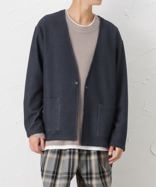 表面が鹿の子編みのダブルフェイス素材を使用しており、裏側の配色がカジュアル感を演出します。カラーは、ブラック・ブルー・ネイビーの3色展開です。シンプルなデザインなので、どんなボトムスとも合わせやすく、カジュアルな着こなしからリモートワークスタイルなど様々なシーンでの羽織物として活躍します。デニムやチノパンはもちろん、ワイドパンツ、スウェットパンツとも合わせやすい。スキニーパンツやスラックスと合わせたきれいめスタイルもおすすめ。■モデルサイズ179cm 56kg B:86/ W:72/ H:81着用サイズ:L※商品画像は、ご覧になられているパソコン、ディスプレイ等の設定により、実際の色味とは異なる場合がございます。