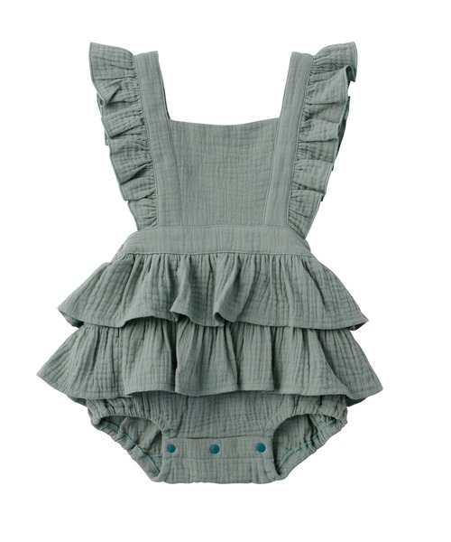 肌当たりの良い綿ガーゼ素材 肩&腰のラッフルフリルがかわいい トレンドのスモーキーカラー 【対象月齢】 70cm:6から12カ月 80cm:12から18カ月 【お手入れ方法】 ・液温は40℃を限度とし、洗濯機で非常に弱い洗濯ができる ・塩素系及び酸素系漂白剤の使用禁止 ・タンブル乾燥禁止 ・日陰のつり干しがよい ・アイロン仕上げ禁止 ・ドライクリーニング禁止 【注意事項】 ・タンブル乾燥機は使用しないで下さい ・漂白剤や蛍光増白剤を配合した洗剤は使用しないでください ・洗濯ネットをご使用ください