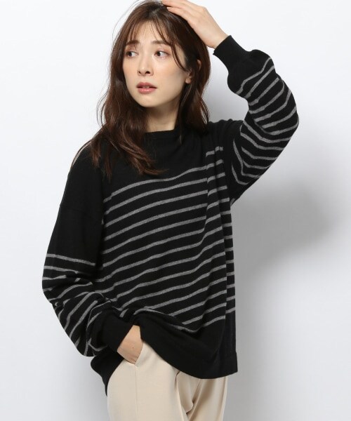 ーーーカシミヤ入りで柔らかい、ゆったりサイズのカジュアルボーダーニット。カジュアルなボーダーのニットですが、着用すると袖口の丸いカーブがクシュっとたまり少しモードな袖のトップスです。程よいゆったりサイズでリラックスして着用できます。ーーー【スタイリング】パンツ合わせでもスカート合わせでもきまる、程よいゆったりシルエット。テーパードパンツやデニムはもちろん、ジョガーパンツなども合わせてみてください。カシミヤ混の柔らかいタッチで、いつものカジュアルコーデに上品さをプラス出来るワンランク上のボーダートップスです。【素材感】カシミヤ混の柔らかさがありながら、ウールナイロンを混紡することによってラフでカジュアルな印象のニット地を、ボーダーに使用しています。