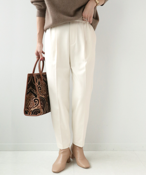【2021AW】 B.C STOCK 毎年大好評の起毛TRテーパードパンツが、生地をリニューアルして新登場! 今年はカットジャージメルトン素材を使用しています。 表地のみ起毛しており、ややストレッチ性のある素材。 イージーな着用感をさらにアップさせました! 形はウエストゴムの履きこみタイプ。 センタープレスで美脚を演出、ファスナーみせかけ仕様で高見えを叶えました。 オンオフ兼用でお使い頂ける万能ボトムです。 ********************** 透け感:ややあり 裏地:なし 伸縮性:なし 光沢感:なし 生地の厚さ:普通 ********************** 【スタッフ着用コメント】 《スタッフ staff.s》 身長:165cm/普段サイズ:S~M/着用サイズ:フリーサイズ サイズ感:タックが入っているため、腰周りはゆったりめです。 ウエストは後ろのみゴムになっており、幅広い体型の方に着て頂けます。 素材感:表面は起毛がかっていて、ウォーム感のある素材です。 着心地: 全体的に締め付け感が無く、長時間穿いても疲れにくそうな着心地です。 ********************** ※取り扱いについては、商品についている品質表示でご確認ください。 ※店頭・屋外での撮影画像は、光の当たり具合で色味が違って見える場合があります。商品の色味は、スタジオ撮影の画像をご参照ください。 モデルサイズ:H165 着用サイズ:フリー 本体:ドライクリーニング