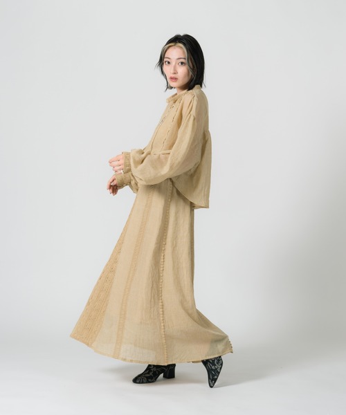 肌触りの良いコットンガーゼでお作りしたAurich lace shirt Set up(オーリッチレースシャツセットアップ)。花の色味から着想して染めた柔らかな色合いが特徴で、シャツ、スカート共に様々なレースをふんだんに用いデザインしました。セットアップでワンピース見えする着方はもちろん、それぞれ単品使いもしやすく、着回し出来るところもポイントです。