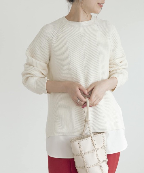【品良くモダンなシャツレイヤードニットプルオーバー】 畦編みニットとシャツ生地を縫い合わせ、レイヤードしたようなデザインに仕上げました。 一枚で様になり、トレンドスタイルが完成します。 程よくゆとりのあるサイジングでストレスフリーな着心地を実現し、深めのサイドスリットが抜け感をプラス。ワイドパンツやプリーツスカートなど合わせるボトムを選ばず、いつものワードローブに加えたい万能アイテムです。 ※この商品は、摩擦や汗、雨などの使用条件等により、色落ちや他の物への色移りの可能性がございますのでご注意ください。 ※商品画像は、光の当たり具合やパソコンなどの閲覧環境により、実際の色味と異なって見える場合がございます。予めご了承ください。 ※商品の色味の目安は、商品単体の画像をご参照ください。 ----------------------------- 透け感 : ややあり(シャツ部分) 伸縮性 : あり(ニット部分) 裏地 : なし 光沢 : なし ポケット : なし -----------------------------