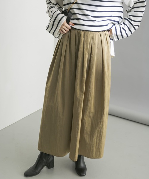 【表情を変える素材感でコーディネートを彩るギャザースカート】 撥水性に優れ、シワになりにくいLIMONTAの素材を使用したギャザースカート。角度によって見える微光沢が目を引く表面感のある生地で、裏地なしでも透けにくい軽い着心地の1枚です。ナイロンのハリ感が綺麗なシルエットを演出し、調節可能なウエストの紐で体型問わず着こなして頂けます。 POINT ・コーディネートのポイントになる微光沢素材 ・ストレスのない軽い着心地とウエストゴム ・体型問わずお召し頂きやすいウエスト調節紐付き COORDINATE ニットやスウェットなどマットな素材感のトップスと合わせたコーディネートがおすすめ。 ※洗濯の際は、色落ちすることがありますので、単独洗いをしてください。 ※その他お取り扱いに関しましては、商品に付属のアテンションタグをご覧ください。 ※商品画像は、光の当たり具合やパソコンなどの閲覧環境により、実際の色味と異なって見える場合がございます。予めご了承ください。 ※商品の色味の目安は、商品単体の画像をご参照ください。 ▼お気に入り登録のおすすめ▼ お気に入り登録商品は、マイページにて現在の価格情報や在庫状況の確認が可能です。 お買い物リストの管理に是非ご利用下さい。 ----------------------------- 透け感:なし 伸縮性:なし 裏地:なし 光沢:あり ポケット:なし -----------------------------