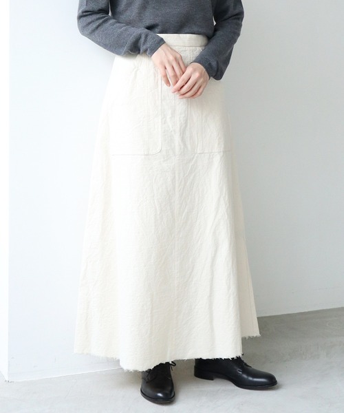 オーガニックコットンを使用した綾目組織の生地。生機をバイオワッシャーで仕上げ、素材そのままのナチュラルムードが素敵です。粗野なネップの雰囲気が独特のニュアンス感を引き出しています。マテリアルの良さを感じる生成のみのカラーパレット。ナチュラルながらも直線的できりりとした印象のロングスカート。下半身がすっぽりと隠れるので、スタイルが決まりやすくついつい手が伸びる一枚になりそう。秋のスウェットから真冬のニット、夏のTシャツにと一年中楽しめます。※こちらの素材はネップ、スラブ感をあえて出している特別な生地となっております。1点1点風合いが異なる場合がありますが、こちらの商品でしか味わえない特性をお楽しみください。同シリーズでワンピース【 2201OP003212 】も展開しています。同デザインの素材違いのスカート【 2201SK001212 】も展開しています。洗濯:手洗い可※画像はサンプルです。実際の商品と仕様・加工・サイズ等が若干異なる場合がございます。※撮影画像は光の当たり具合やモニターの環境により色味が違って見える場合がございます。※取り扱いの注意については取り扱い表示をよくご確認の上、着用をお願い致します。※この製品はファスナーを使用しています。乱暴に扱いますと故障する恐れがあります。ご注意下さ い。洗濯の際は優しく手で押し洗いして下さい。※この製品は独特の風合いを出す為に製品洗いをしています。一枚一枚の色味、風合い、サイズ等も微妙に違いますが、他の製品では味わえない雰囲気をお楽しみ下さい。