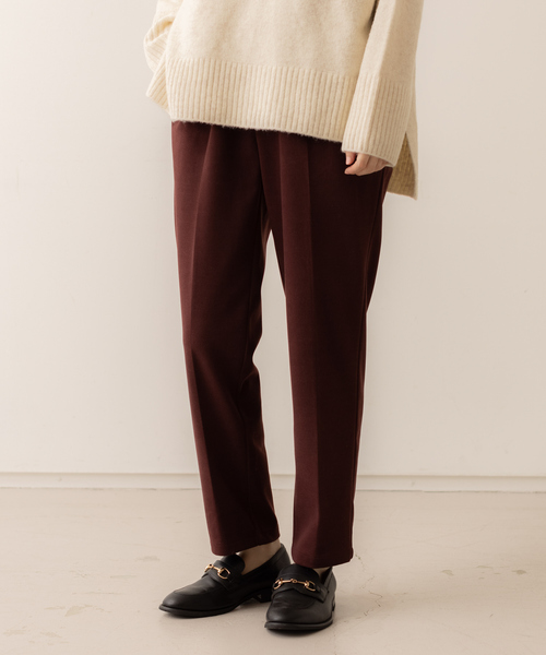 布帛見えのジャージー素材のイージーテーパードパンツ。センタープレスでシルエットがとてもきれいな1本。程よいストレッチ感で履き心地も抜群です。普段使いはもちろん、通勤にも♪