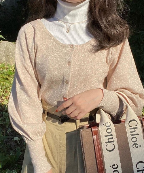 Mysa&Liina × yuririn* コラボアイテム ☆ 【MATERIAL】 ハイゲージニット全体にシャンパンゴールドラメを施してあるロマンティック素材 柔らかでキックバックのある伸びる編地です。 細やかなラメを使用しているので、チクチクしづらい点もポイント。 【DESIGN】 ハイゲージ×全体に広がるラメニットが上品でガーリーなカーディガン。 前後2WAYで着用できる仕様になっています。 前をあけてカーディガンにも使用でき、3WAYスタイルを楽しむことのできる、万能アイテム 1から染めたニュアンスカラーはどの色もゆりりんこだわりのカラーセレクトです。 袖口の長めのリブが、手首を細く見せてくれ、ボリューム袖とのギャップがさらに華奢見えポイントに。 人気のショート丈アイテムで腰高コーデに◎ ワンピースやちょっとしたパーティーにも羽織って行けるきれい目ニットとしても大活躍。 ※敏感肌の方や、肌触りが気になる方はインナーを着用されることをおすすめします。 【関連ワード】 2WAY:ラメ糸:ボリューム袖:リブ仕様:ショート丈:コンパクト yuririn:yuririn*:ゆりりん:くまぞう:ガーリー:甘め:大学生:ゆるふわ <CARE> ※詳しくは製品に付属している洗濯表示をご参照ください。 ※撮影環境により、多少実際のカラーと異なる場合がございます。 また、携帯やスマートフォン、パソコンなどの画面上と実物では多少色が異なって見える場合がございます。 ※ご注文いただいた予約商品のお届け時期の確認は、注文履歴ページより行えます。