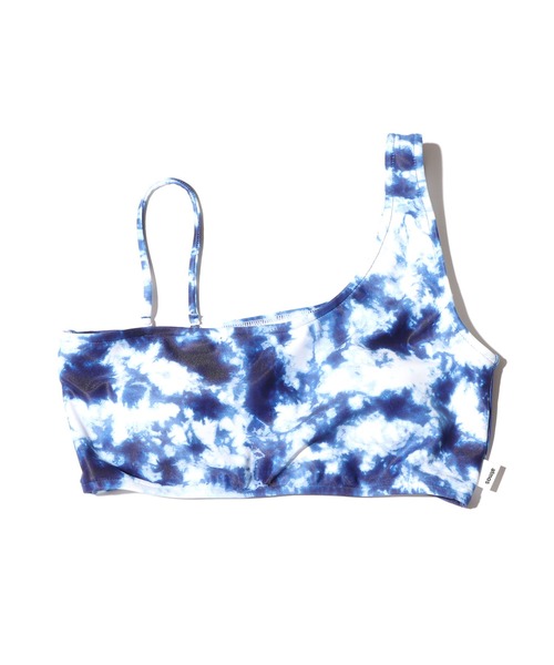 伸縮性があり、肌に程よくフィットする着心地の良い素材のタイダイ柄ワンショルダーブラトップ。 細い左の肩紐は取り外し可能となっており、用途によって使い分けることができます。 カップ付きのためシャツとのレイヤードや1枚での着用も可能です。 品番:21aw-intp03-blu / 21aw-intp03-pnk