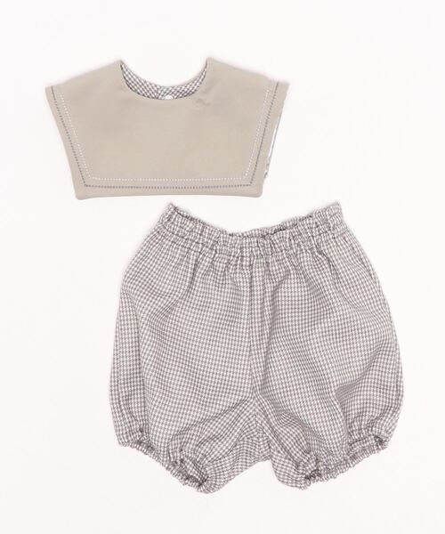 お得でおしゃれなビブ&ブルマのセット/かわいいセーラーカラータイプビブ/男女どちらも使えるデザイン 【サイズ展開】 F(70-80) のみ 【サイズ詳細・対象月齢】 F(70-80)・・・サイズ 詳細【ビブ】前身丈13.5cm、肩巾24cm、首回り28c 【ブルマ】股上19cm、股下6ウエスト38cm、ヒップ70cm ( 6から18カ月 ) 【お手入れ方法】 液温は40℃を限度とし、洗濯機で非常に弱い洗濯ができる 塩素系及び酸素系漂白剤の使用禁止 タンブル乾燥禁止 日陰のつり干しがよい 底面温度150℃を限度としてアイロン仕上げができる ドライクリーニング禁止