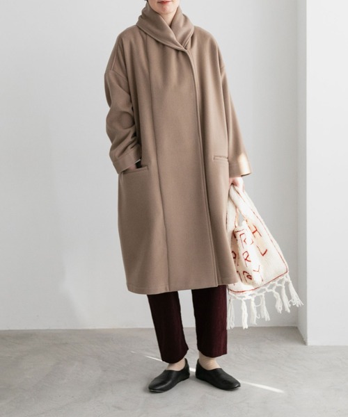 オネット【Honnete】高品質なモノ作りを行う、ファクトリーブランド。Honneteの定番デザインであるショールカラーが印象的なコートのご紹介です。よけいなものがついていない、シンプルなスタイルが潔くてかっこいい。--------------------------------------------------------------------------------------ブリティッシュラムウールを使用したメルトン生地。しっかりとした質感ながらも、柔らかな落ち感とドレープが美しく出る高品質な素材です。立ち上がったショールカラーで首回りを暖かく。包まれるようなデザインですが、ゆったりとしているので苦しくありません。サイドにはポケット付きです。フロントにはオネットのアイテムと言えば!な、着脱しやすい大きめスナップ。さりげなく内側についています。前はダブルのデザインなのでしっかりと暖かいんです。たっぷりとした身幅なのに、すっきりと着られるのが嬉しいですよね。大きなショールカラーは、後姿も抜け目なし、そしてマフラーいらずのあたたかさ。前を開けても大人なルーズ感が漂い、また違う印象になります。ざっくりとルーズに着こなしたり、ボタンの開け方で襟の印象がかえられるので色々なきこなしが楽しめそう。お呼ばれの日のアウターにも、もちろん普段にも、大活躍の1枚です。-----------------------------------------------------------------------【AMB100貨】ひと・もの・ことがぐるりと巡りさまざまな場所で出会った「良いもの」をお届けするオンラインの百貨店です。Clean/unique/cheerfulをテーマに私たちが選んだ様々なジャンルのものを、そのまわりにあるストーリーと共にご紹介しています。----------------------------------------------------------------------------※撮影画像は、光の当たり具合やモニターの環境により色味が違って見える場合があります。あらかじめご了承ください。※取り扱いの注意については取り扱い表示をよくご確認の上、着用をお願いいたします。