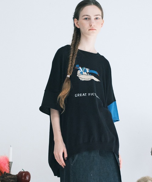 bedsidedrama 2022 S/S "FASHION FROM FICTION" 記憶の中にある大切な物語(フィクション)をかるくて柔らかなニットTシャツに編み込みました。 カラーによって描かれたデザインが異なります。眺めるたびにその時の記憶がよみがって来そうです。 袖部分には異なる配色でワンポイント切り替えを施しています。 やわらかく落ち感のある素材を用いて仕立てたゆったりとしたシルエット。 カジュアルになりすぎず、どこかモードな雰囲気をもったサマーニットです。 MODEL Olga K H172 着用サイズ1 MODEL MOMO KOYAMA H167 着用サイズ1