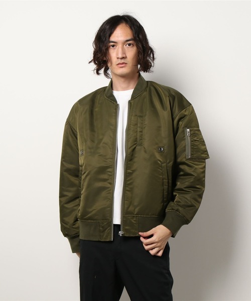 肉厚のナイロンツイル素材を使用し、肩ドロップ、身幅ルーズ、襟袖リブ付き、ワキ箱ポケット付き、袖下切り替え部分にカモフラージュプリント生地を使用したMA-1になります。展開はブラック、カーキの2色展開になります。