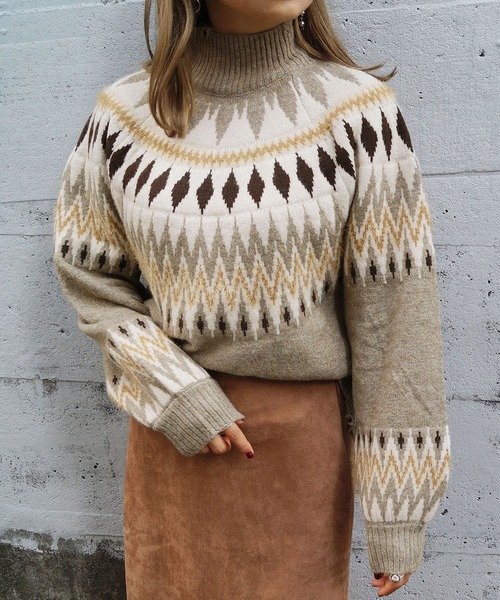 首元から放射状に描かれたノルディック柄が、柔らかく暖かみを感じるニットが登場。表情豊かに季節を彩るアイコニックなアイテムです。ナチュラルな色合いながらも、華やかさをプラスした存在感のあるニットは、大きくゆったり着ることが出来るビッグシルエット。どこかレトロで懐かしいイメージの求心柄ニットですが、ゆったりとした袖巾が叶うラグランスリーブに程よくワイドな身幅、アームホールを採用したオーバーサイズシルエットで現代的かつトレンドライクな印象に仕上げています。一部シャギーヤーンを使用することで立体感とウォーム感のある編み柄を演出しています。衿と裾にはダメージ加工が施してあり、ナチュラルな求心柄のデザインにトレンド感をプラスしています。ダメージ加工により甘くなりすぎず、ボーイッシュさんにも着やすいアイテムに仕上がりました。※屋外での撮影画像は、光の当たり具合で色味が違って見える場合があります。商品の色味は、スタジオ撮影の画像をご参照ください。☆★お買い物をお楽しみいただく為に★☆★商品のお気に入り登録完売カラーの再入荷通知や、ラスト1点の通知、セールの通知も受け取ることができます。★ブランドのお気に入り登録新商品や再入荷等、ブランドのお得な情報をいち早く受け取ることができます。
