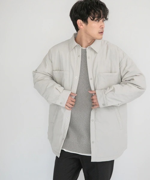 ◆素材 メーカーと共同開発したオリジナル中綿、エアサーマル。 保温性・軽量・嵩高性とアウターに必要な3つの機能性を兼ね備えた注目の合繊素材です。 ◆デザイン ゆとりのあるボックスシルエットのシャツアウターになります。腰ポケット付きなので、 アウターのような印象に仕上げています。 ◆スタイリング 肌寒い時期のライトアウターとして、カジュアルに着るのがおすすめです。 ナイロン素材なので、アウトドアからタウンユースまで幅広く使えます。 程よい中綿のボリュームなので、コートのインナーとしても活用できるアイテムです。