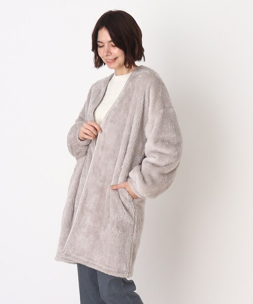 【デザイン】 ふわふわボアを使ったノーカラーコーディガンです。 ボタンとジップなしのトッパータイプなので、さらっと羽織れる手軽さも◎ 同色のサテンパイピングもアクセントになっています。 フェミニンな雰囲気に見せてくれるアイテムです。 使いやすいベーシックなシルエットで寒い季節の羽織にピッタリです。 ※ポケット数:横×2 【生地感】 表裏にふわふわのボアを使っていて軽くて柔らかい生地感もポイントです。 ※照明の関係により実際よりも色味が違って見える場合があります。 またパソコン・スマートフォンなどの環境により、若干製品と画像のカラーが異なる場合もございます。予めご了承ください。 こちらの商品は主に冬に着用いただける商品です。 モデル情報:身長163cm B80 W60 H88 着用サイズ:00 店舗へのお問い合わせ商品番号:741-33302 ●製品寸法: 00(FREE):着丈87cm B108cm 袖丈47cm 肩幅57cm 備考: