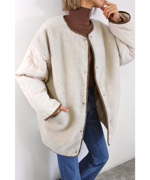 2021 AW 秋冬アイテム 【トレンドのキルティング面とふわもこボアのリバーシブルコート】 気分やコーディネートによって見え方を変えれるリバーシブルミドル丈コート。 ▼Design ・パイピングの配色がポイントに。 ・ゆったりシルエットで厚手のニットもストレスなく着ていただけます。 ・ボア面は袖がキルティングの異素材使いで新鮮。 ・フロントサイドには便利なポケット付き。 ・すっきりとしたノーカラーデザインでマフラーやストールとも合わせやすいのが◎。 ▼Fabric ・あたたかみのあるキルティング仕様。 ・キルティング面は滑りがいいので着脱のストレス無く使用いただけます。 ・縦キルティングですっきりとした印象になっております。 ▼Styling ・ミドル丈なので、パンツ・スカート共に合わせやすくなっております。 ・カジュアルな雰囲気なのでデイリー使いにマストアウターとなっております。 ・中に厚手のニットを着て頂いてもストレスフリーに着て頂けます。 ・中綿とボアで暖かく、ハイネックのニットも襟元を気にすることなく着ていただけます。 ----------------------------------------- 【以下アイボリー参考。カラーにより多少の誤差あり】 ・透け感:透けない ・伸縮性:なし ・生地の厚さ:普通 ・裏地:なし ----------------------------------------- 【スタッフ着用コメント】 身長167cm キルティングなのでとにかく暖かく、リバーシブルで気分によって使い分けれるので便利です。 パンツはもちろん、スカートもシルエットを選ばす合わせやすいです。 ボア面は袖がキルティングなので動きやすくトレンド感あるコーデにしてくれます。