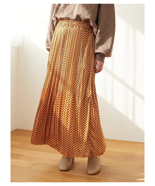 幾何柄がモダンな雰囲気を演出するスカート。 消しプリーツがニュアンシーなフォルムをメイクする1枚です。 ゆったりと穿けるウエストゴム仕様で快適なのもうれしいポイント。 上品なレングス感で大人っぽくコーデがきまる、オンオフ問わずに活躍するアイテムです。