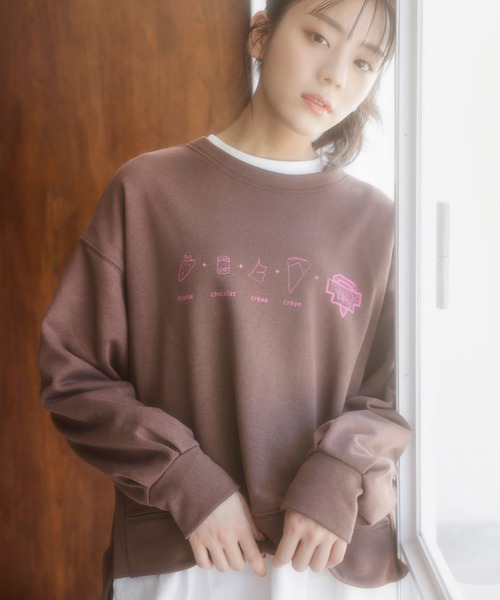 MARION CREPSとViSageのコラボアイテムが登場! MARION CREPS×ViSage 原宿に食べ歩き文化を作ったマリオンクレープとのコラボレーションが誕生しました! 食を洋服と雑貨で表現してお家や日常を楽しんでいただくシリーズです。 【デザイン】 マリオンクレープで一番の人気を誇る、ストロベリーチョコホイップクレープと、バナナチョコホイップクレープを、ViSageでイラストレーターのSATO IKUYOさんにオリジナルで描いていただいたプリントを施しています。 ・ゆったりサイズで、袖にボリュームを持たせてふんわりとしたシルエットに。 ・裾の両脇にベンツ開きを作り、ストレートに着れるシルエットに。 ・素材のイラストを胸元にプリントし、後ろはフランス語でストロベリーチョコホイップクレープと、バナナチョコホイップクレープとプリントしました。 【素材】 コットンポリエステルの裏起毛裏毛です。 コットンだけの裏毛よりもポリエステルが入っているので乾きやすいのもポイント。 【カラー】 ストロベリーは見頃がチョコレートブラウンにピンクのプリント。 バナナは見頃がクリームイエローにチョコレートカラーのプリントにしています。 【おすすめのスタイリング】 同シリーズのギンガムチェックパンツ(BVS41070)と合わせるのがおすすめです! ー ViSage/ビサージュ ー 好きなものに囲まれたい。 好きなスタイルで過ごしたい。 お部屋で過ごす生活を素敵にしたいけど、賢く快適にしたい。 そんな今を生きるリアルガールに答える為に誕生した ViSからのルームウェアライン「ViSage -ビサージュ-」ViS×Sage(賢い) ・Relaxing One Mile Wear ・Active Room Wear ・Comfortable Night Wear 3つのラインで機能性と快適さで手の届くきれいを届けるラインアップ。 ----------------------------- 裏地:なし 光沢感:なし 透け感:なし ポケット:なし 伸縮性:あり 生地の厚さ:やや厚手 ボタン:なし その他仕様:両脇ベンツ入り 季節:秋、冬 ----------------------------- 【モデル着用サイズ】 貴島明日香さん身長:170cm、着用サイズ:F 全色モデル身長:165cm、着用サイズ:F ※画像の商品はサンプルです。 実際の商品と仕様、加工、サイズが若干異なる場合がございます。 ※ロケ撮影画像は、光の当たり具合で色味が異なって見える場合がございます。商品の色味は、詳細や生地アップの画像をご参照ください。