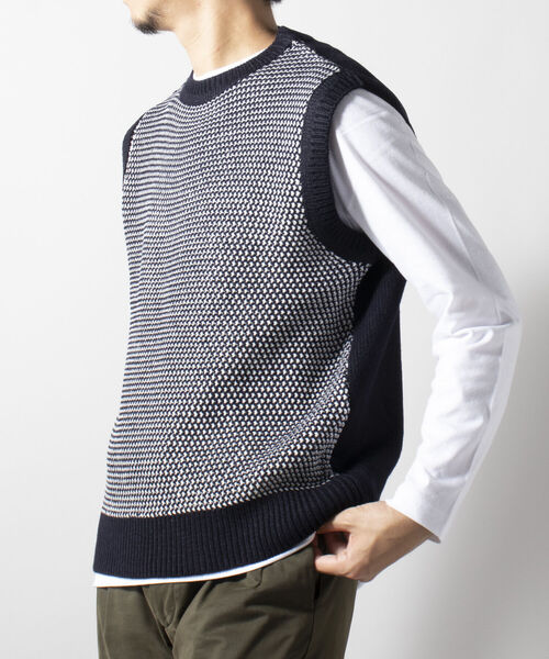 配色糸を使用した地柄のニットベスト。カットソーはもちろんシャツスタイリングも万能に着こなせるアイテム。ロンTもセットになったうれしい一枚着アイテムです。 ※店頭及び屋外での撮影画像は、光の当たり具合で色味が違って見える場合があります。商品の色味は、スタジオ撮影の画像をご参照下さい。 ※製品洗い加工の商品は、寸法に個体差が発生する場合があります。 ※商品画像に関しては出来る限り忠実に表示出来るよう努めておりますが、お客様がご利用のモニターの設定及び特性により、実際の商品と比較し色味に若干の誤差が生じる場合があります。 ※画像の商品はサンプルとなりますので実際の商品と仕様、加工、サイズが若干異なる場合がございます。 ※お取扱い上のご注意 アテンションタグを必ずご確認の上、着用又はお取り扱い下さい。