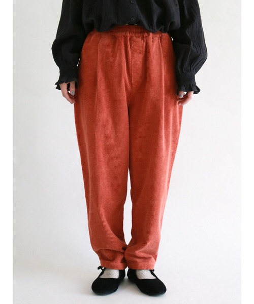 ゆるっと上品な気崩しを可能にするワイド感と寒い冬も暖かいコーデュロイ素材で今季トレンド満載のパンツ。 腰回りはゆったりと、足首に向かって細めに仕上げたテーパードタイプで華奢魅せと抜け感を可能にしてくれます。 裾をロールアップして大人カジュアルに仕上げるのもおススメです。綿100%でふんわりと肌ざわりも最高です。