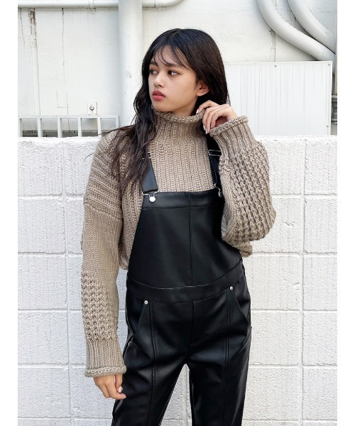 ハイネックのローゲージのニットプルオーバー。 袖先のワッフル編みがアクセントになっています。 襟、袖、裾のロールもポイント。