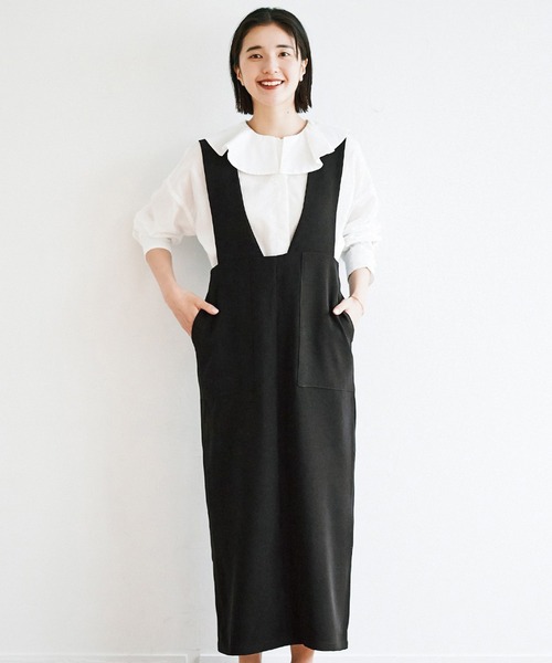雑誌、広告、カタログなどで活躍中の 人気スタイリスト佐藤かなさんプロデュース avecmoi[アヴェクモワ] 実はとびきりユースフル シンプルに合わせるだけで決して手抜きに見えない品のよさにいつも助けられるのが、黒のジャンパースカート。 今回は大人に似合うということを大切に、ウエスト位置を高めにしたペンシルシルエットで都会的に仕上げました。 スカート部分はタイトなシルエットにしているので、伸縮性があってなめらかな布はくのダブルフェイスを採用して、背面にあしらったバックベンツで快適な脚さばきも実現。 トップスのインに着て、スカートライクに装うこともできます。