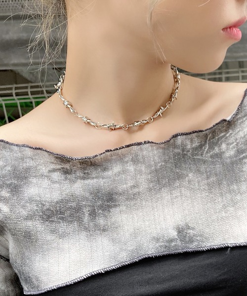 有刺鉄線状のチェーンがユニークなチョーカー。モードからストリートスタイルにまで落とし込みやすい1点。アジャスターでサイズ調整が可能です。※有刺部分は丸みをつけているので刺さることはありませんが、強い力で肌に押し付けないようにお気を付けください。 《お気に入り登録》・「商品のお気に入り登録」で再入荷通知や、ラスト1点の通知、セール通知も受け取ることができます。・「ブランドのお気に入り登録」で新商品や再入荷など、いち早くブランドのお得な情報を受け取ることができます。【Figments/フィグメンツ】ファッション、音楽、カルチャー。時代とともに変化を楽しむ者たちに向けた、Realityを覆し、常識を壊すユニセックスファッションブランド。