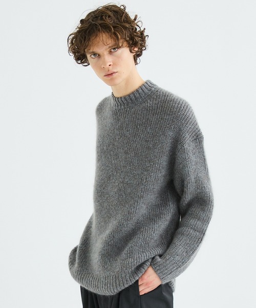 デザインモヘヤ素材を使用したニット。優れた光沢と肌触りがとても滑らかなキッドモヘヤはチクチク感も少なく、着心地抜群です。シンプルなクルーネックデザインが、綺麗な糸を使用した素材の良さを体感できる1着。1枚でもインナーでも活躍してくれる為、秋冬シーズンには重宝してくれます。素材生後1年未満のコヤギから刈り取った希少価値の高いキッドモヘヤを使用。シルエット、サイズ感ゆとりのあるビッグシルエット。