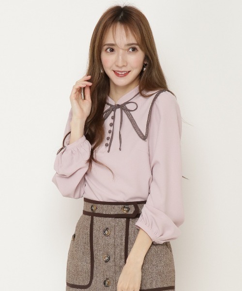 トレンドのビッグカラーとクラシカルなムードを兼備♪【Design】・甘さ控えめの繊細なレースを効かせたオトナ仕様の付け襟がポイント。ビッグカラーでトレンド感をアピールしながら、お顔まわりをパッと華やかに演出できて小顔効果も狙えます♪・付け襟を外すと程よくきちんと感のあるプチハイネックで、通勤やリモートワークにも◎・身頃は程よいゆとりを備えたすっきりシルエット、袖はしなやかなパフスリーブで、女性らしい上品に着こなしへ・・♪・くるみボタンがアクセントになったバイカラーでクラシカルな雰囲気が薫ります。・左ジップ式。前ループボタン留め。【Fabric】・しなやかでドレープ性のある上品な風合いのジョーゼット。薄手ながらもデシンのように透けにくい生地感で、程よい弾力性があるのでシワになりにくいのもポイント。・秋や春は1枚で、冬はあったかインナーなどをプラスして、ロングシーズン使いやすい素材感です。【Care】洗濯機洗い可能M:(02):着丈53cm/身幅45.5cm/肩巾34cm/袖丈58.5cm/裾幅50cm