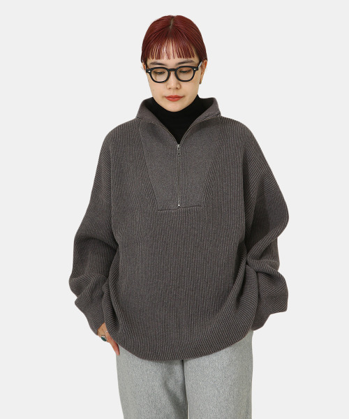 【デザイン】・BALLAST ARK(バラストアーク)の「Half Zip Knit(ハーフジップニット)」・フロントのハーフジップがレトロ感漂うデザイン、ハーフジップにより通気性を高め、温度調整をしやすく、着脱、肩回りのストレスがない仕様・ハーフジップにより、首周りのインナーとのレイヤードも楽しめ、着回しの効くユニセックスでも着用できるデザインに・腕周り、身幅など全体的にボリュームを持たせることで、厚手のスウェットやシャツなどのレイヤニングも可能【素材】・コットン×カシミヤならでのとろんとした素材感が魅力【シルエット・サイズ】・全体的にゆったりとしたシルエットが特徴