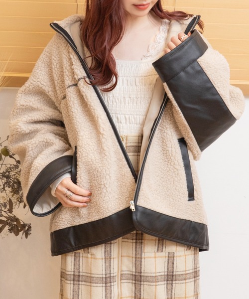冬アウターの定番ボアブルゾン☆【MATERIAL】ポリエステル100%ですので、軽くて手軽に着られるアイテムとなっています。【DESIGN】今年も人気のボアブルゾン。今年は写真に映えるデザインで登場☆フード付きのシルエットがカジュアルさをプラスしてくれます♪合皮素材の当て布が肘下に施され、ポケット口と袖口、裾には切替部分に使用されています。フード端やファスナー部分にはパイピングとして使用され、ボリューム感のあるボアながらも素材とカラーで締まりのあるデザインとなっています。落ち感のある大きめフードと、程よくゆとりのあるサイズ感で、華奢見え効果も♡冬の厚手ニットやパーカーの上からもご使用いただけます◎パンツスタイルに合わせて、ストリートカジュアルな着こなしももちろん、スカートやワンピースと合わせてカジュアルガーリーな着こなしにもおすすめの着回しアイテムです♪【関連ワード】通気性:オーバーサイズ:フリーサイズ:フード:同色パイピング:秋コーデ:冬コーデ:きれいめカジュアル:レザー:アウトドア:ブーツ:ショートブーツ:ヴィーガンレザー<CARE>※詳しくは製品に付属している洗濯表示をご参照ください。※撮影環境により、多少実際のカラーと異なる場合がございます。 また、携帯やスマートフォン、パソコンなどの画面上と実物では多少色が異なって見える場合がございます。