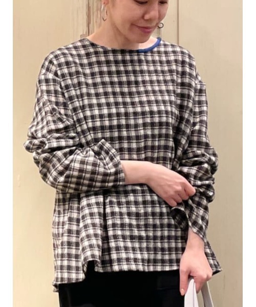 先染めチェックのプルオーバーブラウス。 ネック部分にはいった、さし色の糸で手でかがったような刺繍がアクセントに。 後ろ襟にボタン、タックがあり、身頃に向けた広がるデザインです。 極細コットン糸を、熟練の職人技術で限界まで撚糸(糸を回転させてしぼる)を施した糸をあみあげたボイルガーゼを使用。さらりとした肌触りで、軽くて透け感があります。ガーゼにも似た風合いですがガーゼよりしっかりした風合い。