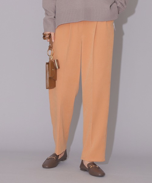 パウダリータッチなツイル素材を使用したタックパンツ。コーデュロイのような光沢感がありながらもカジュアルすぎない素材感で、きれいめに決まります。センタープレスが入っているのもきれい見えするポイント。ストレッチ性があり、ウエスト後ろはゴム仕様だから穿き心地も申し分なし。カラーパンツがトレンドの今シーズン、派手すぎないこだわりのカラーでご用意しました。 ※モデルの着用画像の場合、光の当たり具合により、実際の色味と異なって見えることがございます。色味は、商品単体の画像をご参照ください。 CanCam2月号掲載