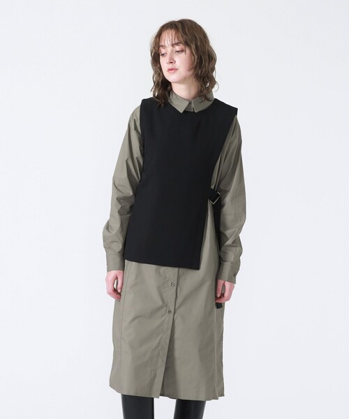 マニッシュなレイヤードスタイルが叶う、ベスト&シャツドレスのセットアイテム。 【素材】 シャツには、上品な光沢感が魅力のストライプ柄とこなれ感のあるカーキを使用し2色で展開。 ストライプタイプはピッチの異なるストライプをブロッキングすることにより、メリハリをつけ細見え効果にも期待が持てます。 ベスト部分は程よい厚さのツイル素材でシャープな印象に仕上げました。 【シルエット・デザイン】 バストから裾に抱えてゆったりと広がるサイジング。 落ち着いた丈感のAラインシルエットですので上品に着用して頂けます。 両サイドにスラッシュポケットが付いているので、何かと便利な1着。 ベストはサイドのベルトでフィット感の調整が可能です。 【スタイリング/その他】 ドレスとしての着用からニットパンツやスキニーボトムスとのレイヤードスタイリングにもマッチするコーディネートの幅の広がる1着です。 着丈/59.5cm 肩幅/36.5cm