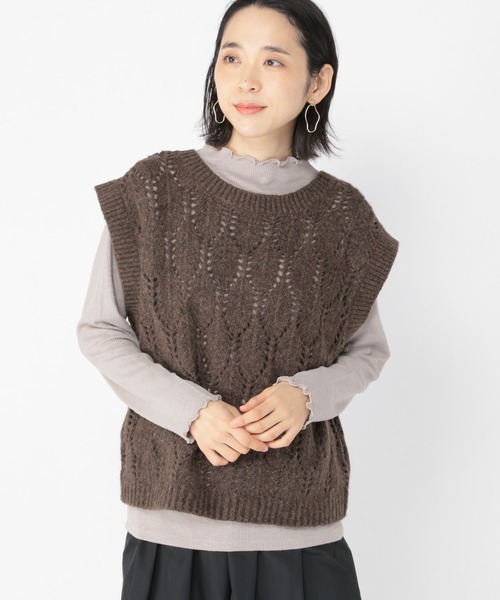 ーーー リーフのような透かし柄が特徴のニットベスト。 透け感のある柄ですが起毛感のあるエアリーな素材で秋にピッタリなウォーム感のあるアイテムに。 前後で着用可能な2WAY仕様も嬉しいポイント。 裾からインナーを覗かせたレイヤードコーデがおすすめです。 ーーー