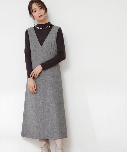 クラシカルな雰囲気に仕立てたツイードジャンパースカート。落ち着いたツートンカラーのツイード素材はインナー合わせがしやすい表面感のある風合いです。 ボディラインがきれいに見えるように、細めの広がりすぎないシルエット、前後のV開きでレイヤードスタイルをシャープに見せてくれます。 ウエストの切り替えを少し高めに設定するとこでスタイルアップを期待できます。 ハイネックブラウスやニット、シンプルなデザイントップスとも好相性です。
