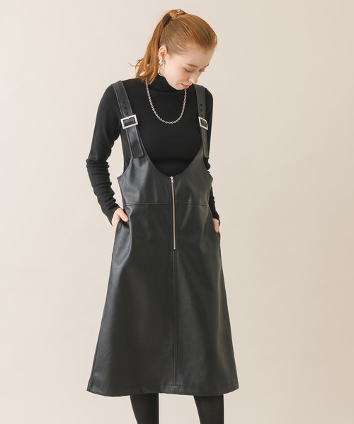 トレンドのフェイクレザー素材を使用した大人かわいいジャンパースカート。 肩ひものベルトに施されたメタリックな金具と、フロントのZIPがアクセントになり、より大人っぽさと辛さをプラス。 程よく柔らかさのある、マットな合皮素材なので着こなしやすいのも嬉しいポイントです。 バックに入ったスリットは大人の女性のモード感を演出。動きやすいデザインなのも◎ カットソーやブラウスなど様々なアイテムとも合わせやすく、秋に冬に、春にも着回し力抜群な万能アイテムです!