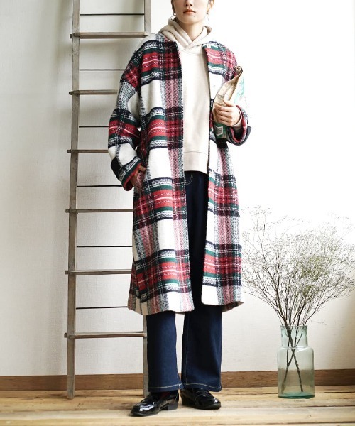 ズーティーだけの完全オリジナルなチェック柄と生地zootie(ズーティー)だけの完全オリジナルなチェック柄と、ウール混で保温性のあるオリジナル生地で仕立てたノーカラーチェックコート。ポコポコとしたニットのようなしっかりとした生地は、見た目にもあたたかな雰囲気を与えてくれます。裏地は滑りの良い生地なので脱ぎ着しやすく、ごわつきにくい着心地。首元はすっきり綺麗に見せてくれるノーカラーデザイン。首元にボリュームがあるトップスと合わせたり、ストールなどもアレンジしやすい優れものです。程よいロング丈なのでパンツはもちろん、スカートとも相性ぴったりでコーデの幅が広がります。トーンが重くなりがちな冬のコーデに、羽織るだけぐっと着映えすること間違いなしの主役級アウター。大きめのチェック柄で着膨れ感なくすっきり見せることができ、冬のコーデに取り入れたい万能アイテムです。洗濯:ドライクリーニング石油系溶剤による弱いドライクリーニングができます