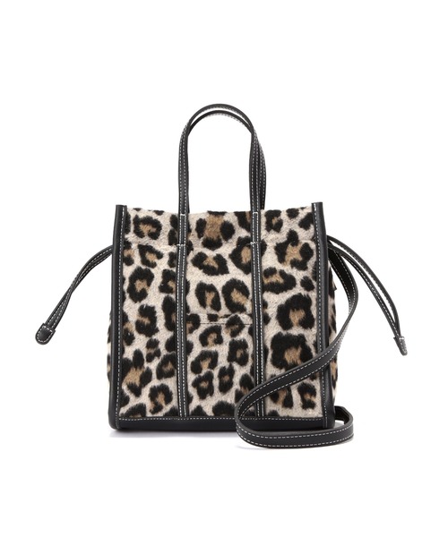 起毛感のあるレオパード柄を使用したショルダーバッグ。合皮素材をサイドに合わせているコンビ素材が特徴。小さいサイズが可愛らしく、口元を絞ると巾着バッグとしてもお使いいただけます。取り外し可能なショルダーベルト付きの2Wayデザインです。