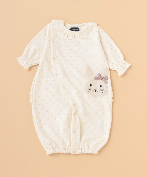 ウサギさんのポシェット風アップリケがお出かけ気分を盛り上げる長袖2WAYオールです。 ふかふかなボア素材とベルベットリボンのアクセントを添えて、愛され上手なルックスに♪ 衿とお尻部分のフリルは女の子らしさをさらに強調します。さりげないドット柄もおしゃれなポイント。同デザインのトレーナー(品番:5114208)を展開しているので姉妹でおそろコーデも楽しめます。【おすすめの着用時期は冬シーズン】【透け感】透けない【生地の厚さ】普通【伸縮性】あり【裏地】なし【ポケット】なし